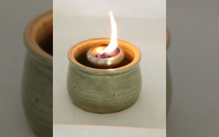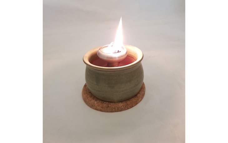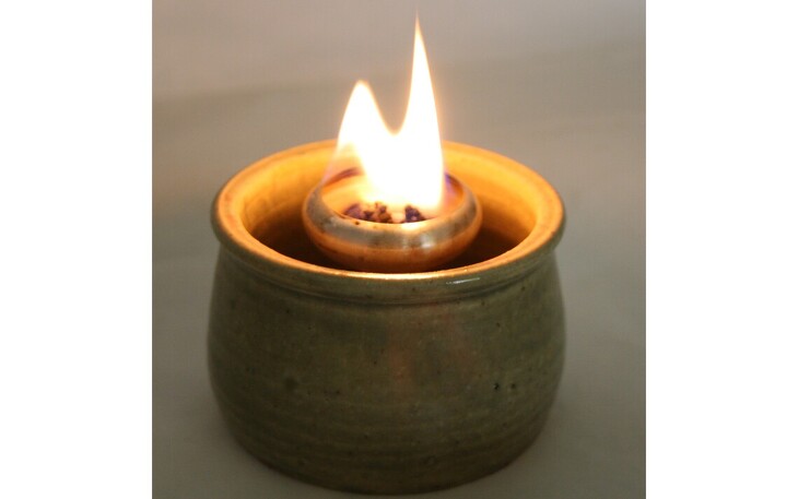 Das Töpferlicht, wird mit Kerzenresten oder Wachsgranulat betrieben. Der mitgelieferte Deckel ist zum Löschen der Flamme gedacht.