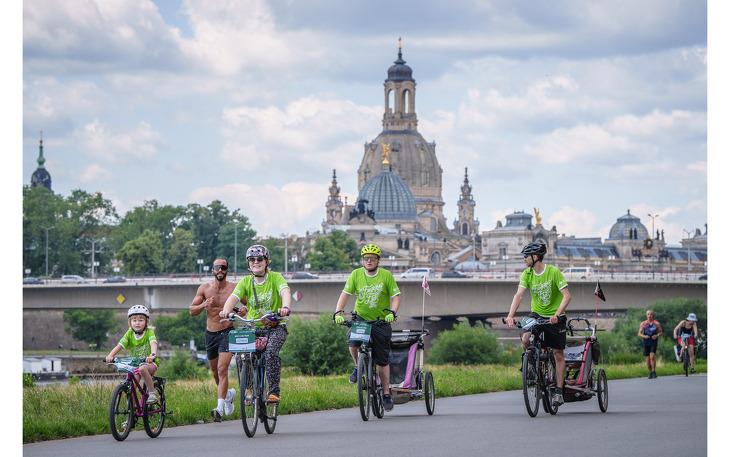 Immer in Elbnähe drehen die jüngsten Radler und ihre Familien die etwa fünf Kilometer lange Kinder-Runde. Vom Start am Volksfestgelände rollen sie zur Marienbrücke und auf die andere Seite des Flusses – dank der vorausfahrenden Polizei ausnahmsweise nicht nur auf dem Fußweg. Der bunte Pulk passiert das Japanische Palais, den in der Sonne glänzenden Goldenen Reiter und das malerische Jägerschlösschen mit dem Volkskunstmuseum. Über die Albertbrücke geht’s zurück auf die Altstädter Seite, wo am Ufer die Dampfer ankern und hoch oben die Gebäude der Brühlschen Terrasse thronen. Nach einem „Schlussspurt“ vorbei am Kongresszentrum warten am Parkplatz Ostrastraße die verdienten Medaillen.