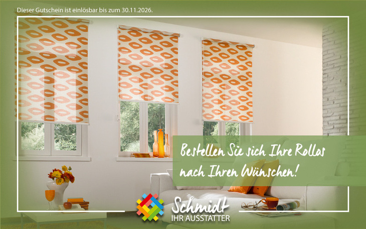 Sichern Sie sich einen 250 € Gutschein für ein maßgefertigtes Rollo Ihrer Wahl bei Schmidt – IHR AUSSTATTER! Entdecken Sie eine beeindruckende Auswahl von über 200 Stoffen, darunter auch Dimout- und Blackout-Varianten für eine individuelle Lichtregulierung bis hin zur vollständigen Abdunklung. Besonders stilvoll sind die modernen Doppelrollos, die mit ihrem eleganten 3D-Effekt für ein einzigartiges Raumambiente sorgen. Auch für große Fensterflächen bis zu sechs Metern Breite finden Sie hier die passende Lösung. Die Montage ist auf Wunsch ganz ohne Bohren und Schrauben möglich. Wählen Sie zudem zwischen klassischer Bedienung per Kette, komfortabler Fernbedienung oder smarter Steuerung per App.