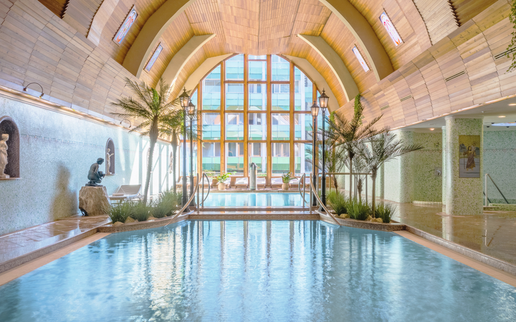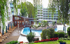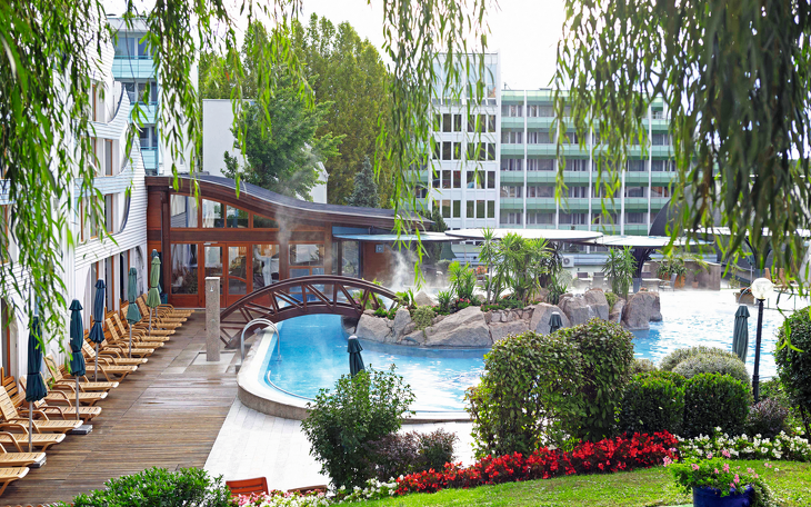 Ruhe und Erholung erwarten Sie mitten in einem großen Park, im Zentrum des für seinen Thermalsee weltberühmten Kurorts Hévíz. In einer Umgebung mit mediterranem Flair finden Sie ein wunderschönes Erlebnisbad mit 1.000 m2 Wasserfläche, 260 klimatisierte Zimmer bzw. Appartements mit Balkon, Dusche/Badewanne, Föhn, Telefon, Sat-TV, Minibar (auf Anfrage) und Zimmersafe, eine Therme wie aus der Römerzeit (2 Becken mit eigener Thermalwasserquelle, Whirlpools, Hydrotherapie, Aroma- und Lichtbäder, erneuerte Sauna-Oase, spezielle Kneipp-Kur).