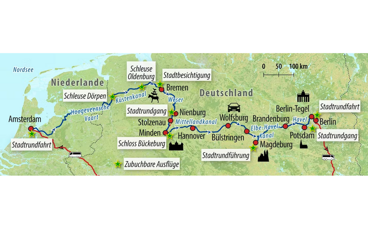 - 11 Tage Flusskreuzfahrt mit MS Johannes Brahms: Amsterdam – Küsten-Kanal – Bremen – Weser – Nienburg – Mittelland-Kanal – Wolfsburg – Magdeburg – Elbe-Havel-Kanal – Havel – Potsdam – Berlin