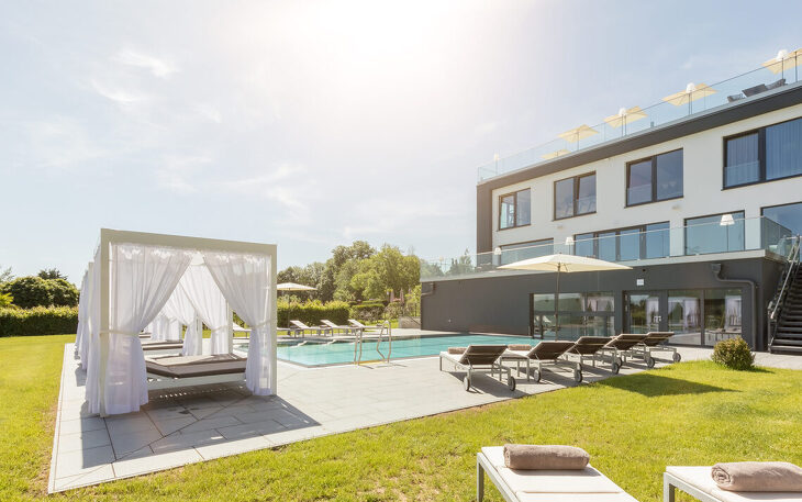 Verbinden Sie Wohlbefinden und Regeneration, stärken Sie Körper und Abwehrkräfte – Wellness pur über 4 Etagen auf 1200 m², mit ganzjährig beheiztem Außenpool – natürlich auch als Day SPA.