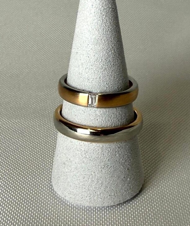 Der Herrenring besteht aus poliertem Platin, durch das das Rotgold an den Seiten leicht durchschimmert – ein dezentes, aber wirkungsvolles Detail, das für besondere Tiefe sorgt. Größe 63. Beide Ringe sind 4 mm breit und angenehm zu tragen.
