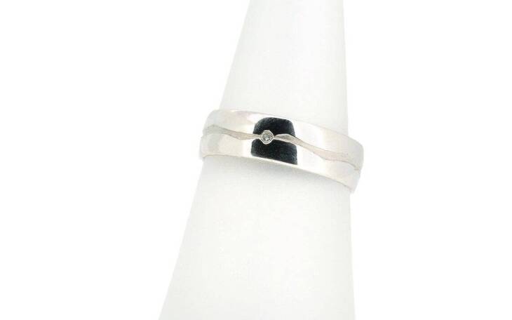 Eine leichte mattierte Welle durchzieht diesen eleganten polierten 333 Weißgoldring in Größe 50. In der Mitte leuchtet ein kleiner 0,005ct Brillant, wie im Glitzern des Meeres.