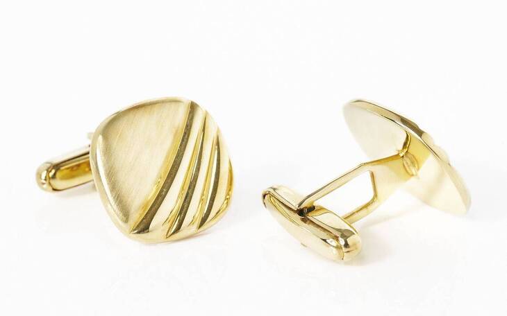 Diese 7 Gramm schweren, viereckigen Manschettenknöpfe aus 585 Gelbgold imponieren duch ihre schwungvollen Einkerbungen und zart mattierte Oberfläche. Klassisch und eindrucksvoll zugleich.