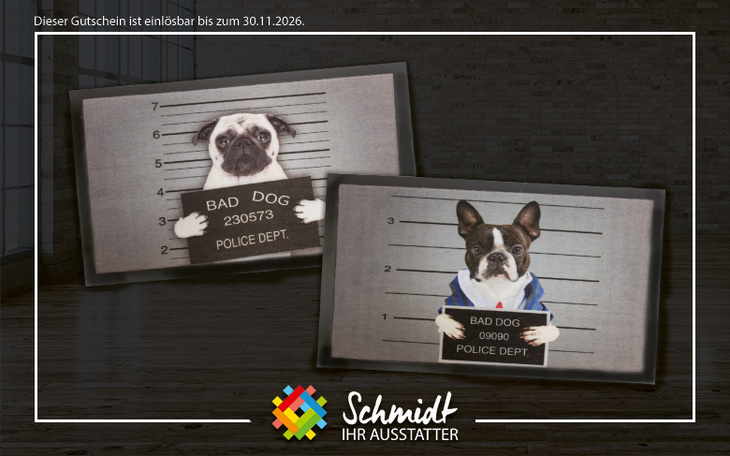 Wählen Sie eine Schmutzfangmatte "Bad Dog" aus zwei verschiedenen Designs*. Mit den Maßen 40 x 60 cm passen sie perfekt vor jede Wohnungs- oder Haustür sowie in den Flur.