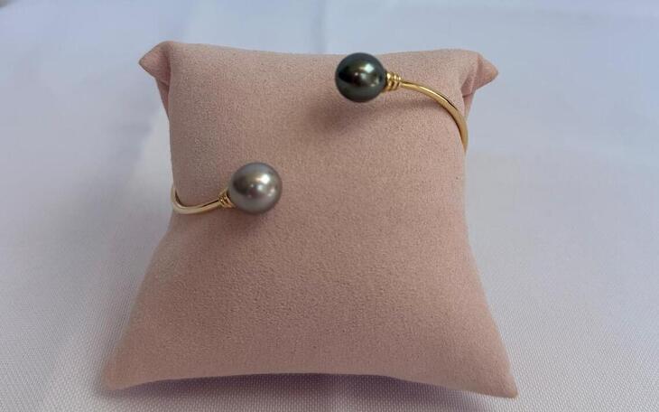 Besonderer Blickfang sind die beiden Natur-Tahiti-Perlen, die den offenen Armreif abschließen. Eine dunklere und eine hellere Perle bilden einen reizvollen Kontrast und unterstreichen die natürliche Schönheit dieser außergewöhnlichen Perlen. Ihr sanfter Glanz harmoniert perfekt mit dem warmen Farbton des Gelbgolds und verleiht dem Schmuckstück eine elegante, zugleich individuelle Note.