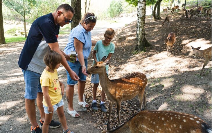 Durch diese geht es auch auf Entdeckungstour mit der Traktorbahn „Anton“ und dabei fährt sie direkt durch den Wald des Familienparks mit großem Wildpark. Darin leben in riesigen Freigehegen Rothirsche, Steinböcke und weiße Damhirsche. Es gibt einen Streichelzoo mit Zwergziegen, Eseln und Zwergeseln sowie Kamerunschafe. Aber das Highlight sind für Familien die direkten Begegnungen bei den Sikahirschen, die man ohne Zaun hautnah füttern und streicheln kann.