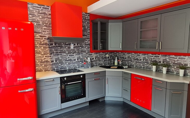 Diese elegante Landhausküche zeichnet sich aus durch die geschickten Kombinationen aus Rahmenfronten und geraden Fronten. Die Pilaster und Kränze bilden eine perfekte Ergänzung und fügen sich harmonisch ein. Sie setzen – zusammen mit den roten Gerätefronten und der roten Wandfarbe - stilistische Akzente und bereichern diese Landhausküche im Vintage-Stil in ihrer Wirkung. Ein weiteres Highlight sind die Quarzstein-APL.