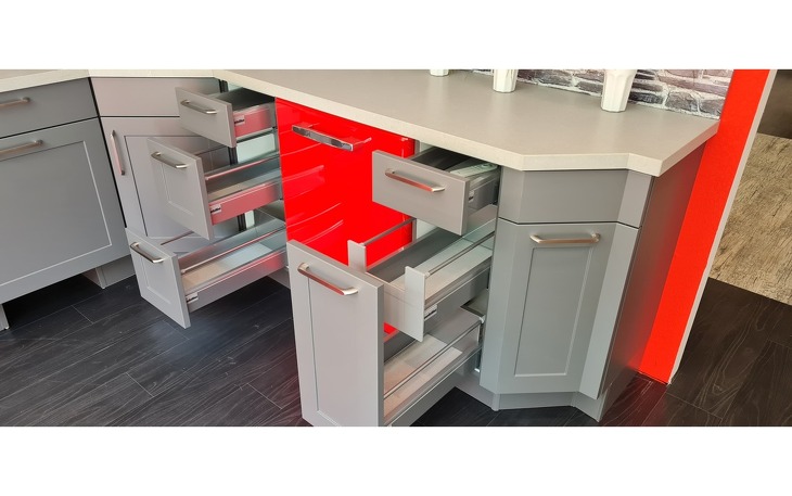 - die Unterschränke in Schiefergrau in der dargestellten L-Form mit vielen Extras (u.a. alle Unterschränke mit Auszügen, z.T. verdeckt),