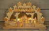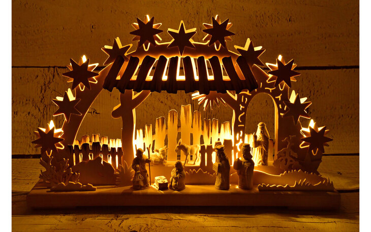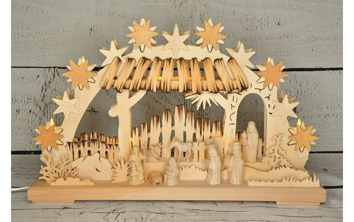 Dieser opulent ausgestattete Schwibbogen zeigt Christi Geburt. Handgeschnitzte Tiroler Massivholzfiguren und gebeizte Holzelemente geben diesem Schwibbogen die besondere Note. Die drei heiligen Könige aus dem Morgenland huldigen dem Christkind mit Geschenken. Die indirekte LED-Beleuchtung erzeugt eine stimmungsvolle Raumbeleuchtung.