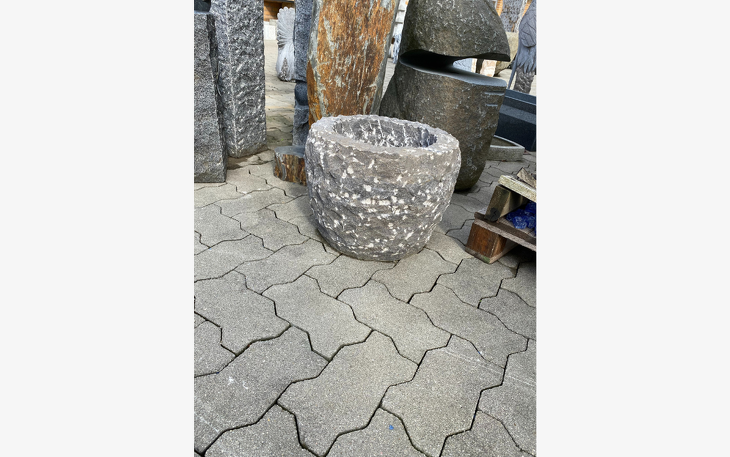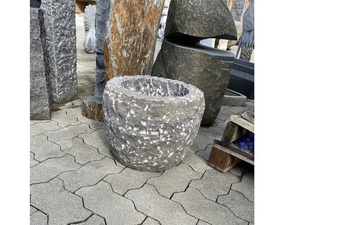 Sie bieten hier auf einen schöner Pflanzkübel aus Naturstein, Anthrazit bossiert,