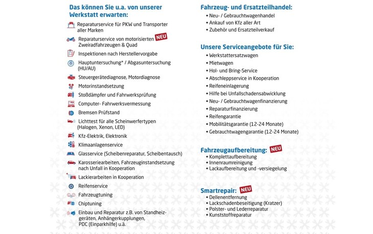 Neben den klassischen Reparaturarbeiten für Pkw, Transporter, motorisierten Zweiradfahrzeugen und Quads bietet die Fachwerkstatt auch Fahrzeugaufbereitungen, Lichttests, Reifenservice oder Smartrepair-Leistungen an. Das Serviceangebot reicht vom Werkstattersatzwagen über Reparaturfinanzierung, Direktabwicklung mit Versicherungen bis zum Gebrauchtwagenhandel.