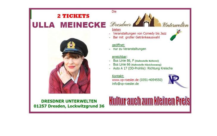Wir bieten Ihnen 2 TICKETS für die Veranstaltung mit Ulla Meinecke in den Dresdner Unterwelten am 13.09.2025 zu ihrem neuesten Programm.