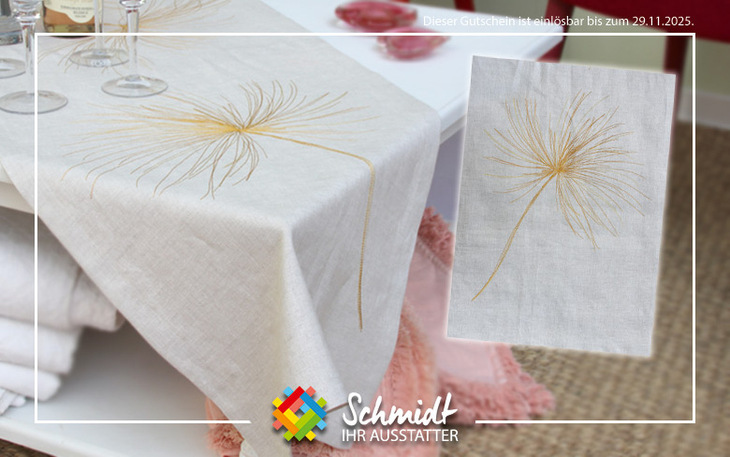 Hinweis: In dieser Auktion ist als Ergänzung ein weiterer Tischläufer, mit selbem Motiv und Material, in einer mit der Stickerei harmonierenden Optik erhältlich.
