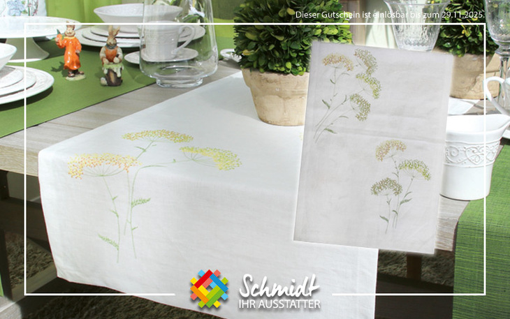 Eleganter Leinen-Tischläufer mit frühlingshaften Farben bestickt bringen Frische und Eleganz auf den Tisch.