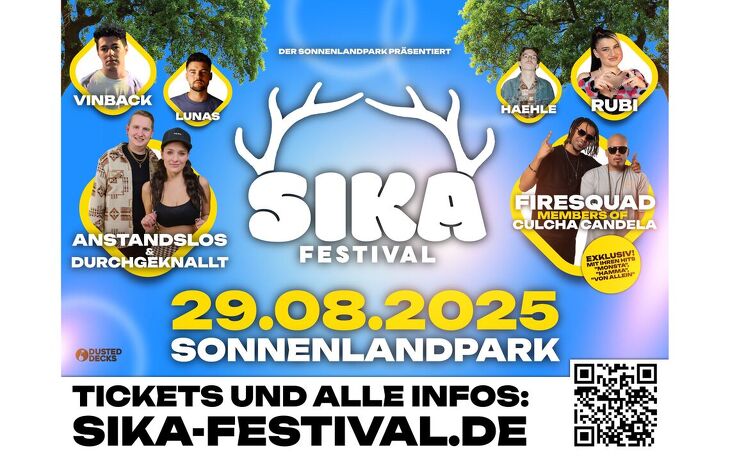 Am 29. August 2025 feiert das SIKA Festival seine Premiere im Sonnenlandpark Lichtenau. Mit einem einzigartigen Mix aus Musik, Erlebnis und regionalen Zusammenhalt schafft das Festival eine neue Plattform für Musikfans aller Altersgruppen. Das SIKA Festival verbindet mitreißende Live-Acts, pulsierende DJ-Sets und eine unvergleichliche Festival Atmosphäre mit dem besonderen Flair eines Freizeitparks. Besucher können sich nicht nur auf ein hochkarätiges Line-up aus regional- und national bekannten Acts freuen, sondern mit dem Kombiticket auch die Attraktionen des Sonnenlandparks nutzen – ein Erlebnis für Familien, Jugendliche und alle Musikbegeisterten in der Region.