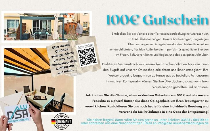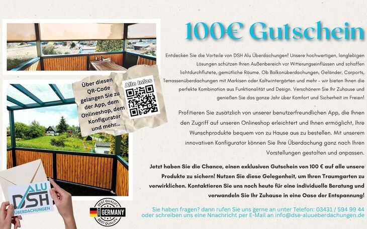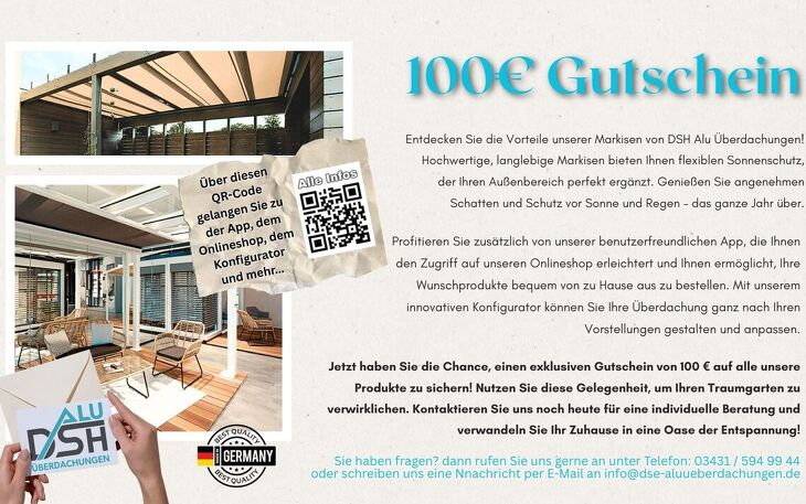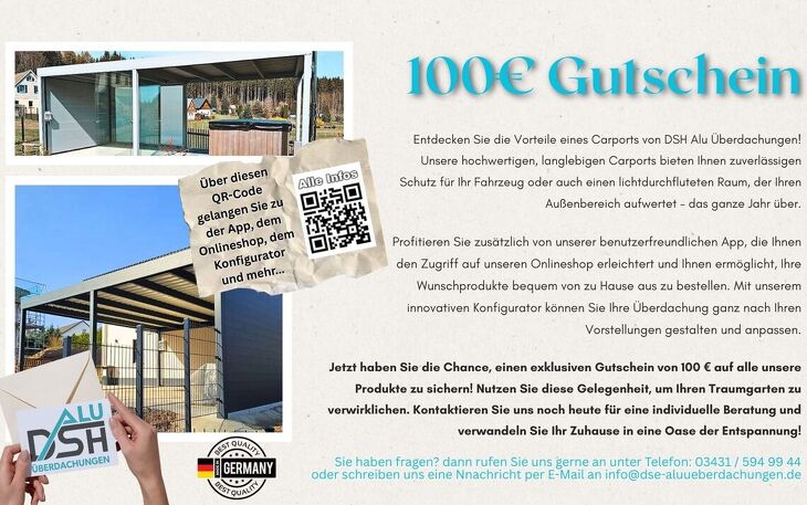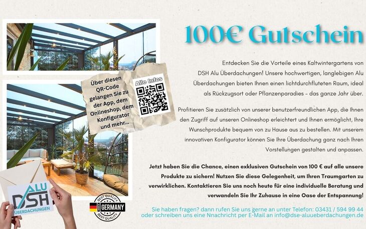 Jetzt haben Sie die Chance, einen exklusiven Gutschein von 100 € auf alle unsere Produkte zu sichern! Nutzen Sie diese Gelegenheit, um Ihren Traumgarten zu verwirklichen. Kontaktieren Sie uns noch heute für eine individuelle Beratung und
