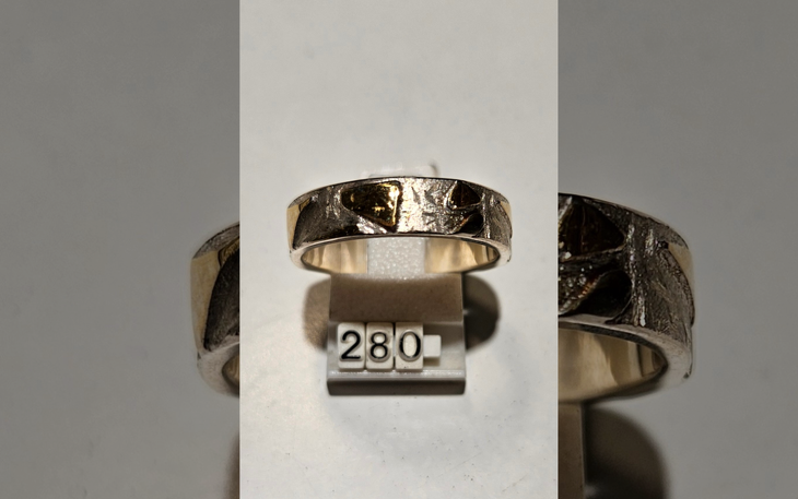 Dieser handgefertigte Silberring mit einer Breite von ca. 5,5 mm besticht durch seine edlen Feingoldbelötungen. Das Zusammenspiel von Silber und Gold verleiht dem Ring eine besondere Eleganz und macht ihn zu einem stilvollen Schmuckstück für jeden Anlass.