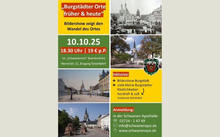 Erleben Sie den faszinierenden Wandel von Burgstädt, festgehalten in Bildern aus vergangenen Jahrhunderten und aktuellen Aufnahmen. Der einzigartige Bildervortrag vom einheimischen Apotheker und Gästeführer Jürgen Hoffmann zeigt, wie sich Straßen, Plätze und das Leben der Menschen in Burgstädt im Laufe der Zeit verändert haben.