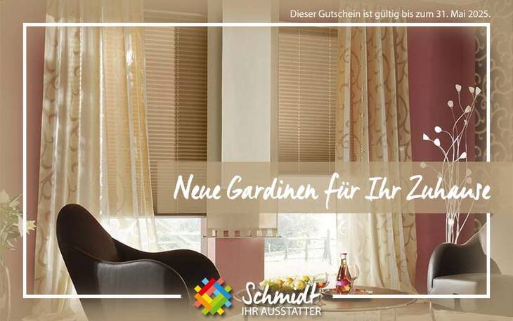 Lassen Sie sich von unserer großen Auswahl an Stoffen inspirieren! In unserem hauseigenen Nähatelier können wir, für alle Fensterformen, die perfekten Fensterdekorationen nach Ihren Wünschen anfertigen. Lösen Sie Ihren Gutschein im Wert von 1000€ für eine Gardinendekoration Ihrer Wahl ein. Schmidt - IHR AUSSTATTER lässt Wohnträume wahr werden!