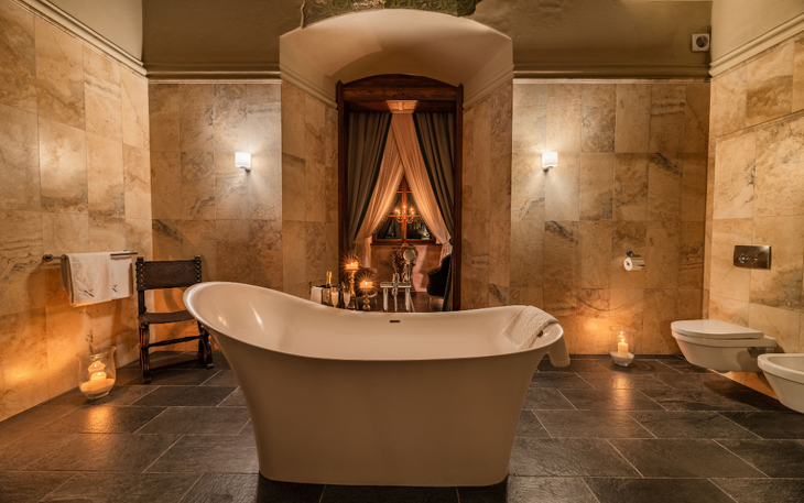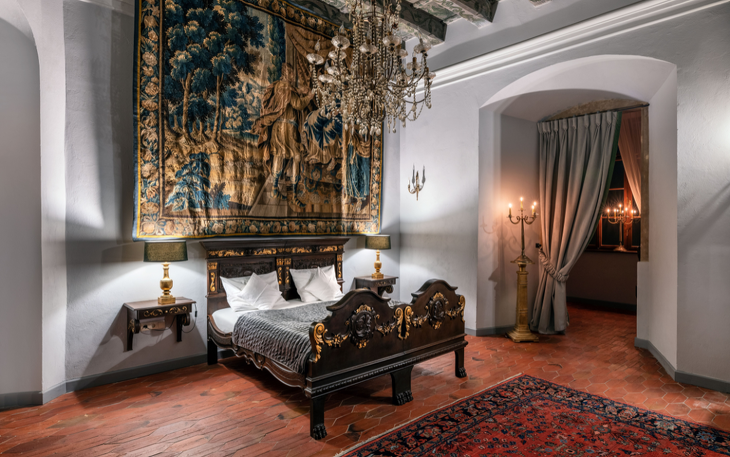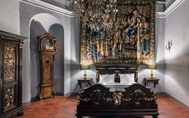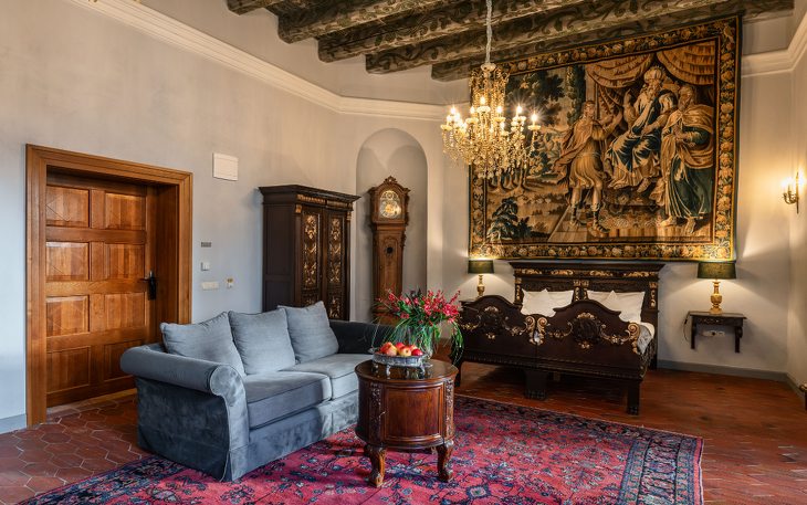Ein geräumiges historisches Apartment mit einem Badesalon, ausgestattet mit Badewanne und Dusche, ist das zweitgrößte Hotelzimmer. Die Wohnung ist in gemütliche Loungebereiche unterteilt und der Erker wurde in ein Arbeitsbüro verwandelt. Die einzigartige Dekoration des Raumes besteht aus bemalten Decken aus der Renaissance aus dem 16. Jahrhundert, Fragmenten von Polychromien, Wandteppichen sowie stilvollen Möbeln und Teppichen. Die Wohnung bietet einen Blick auf die Schlossteiche und die umliegenden Hügel. Die Wohnung befindet sich im Erdgeschoss und ist von der Hotelrezeptionsebene aus sehr leicht zu erreichen.