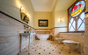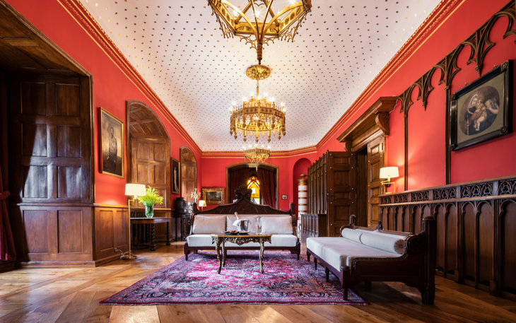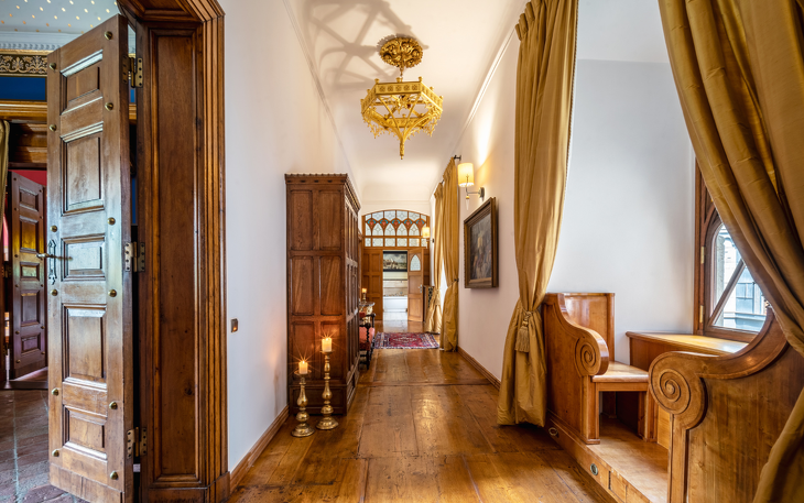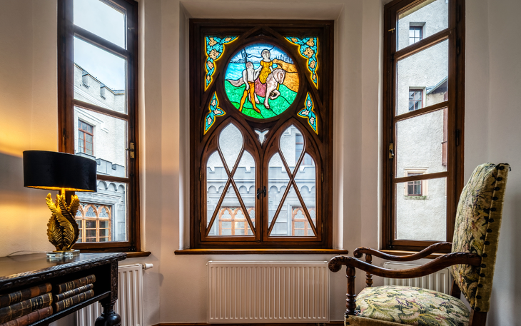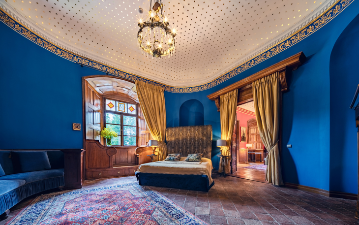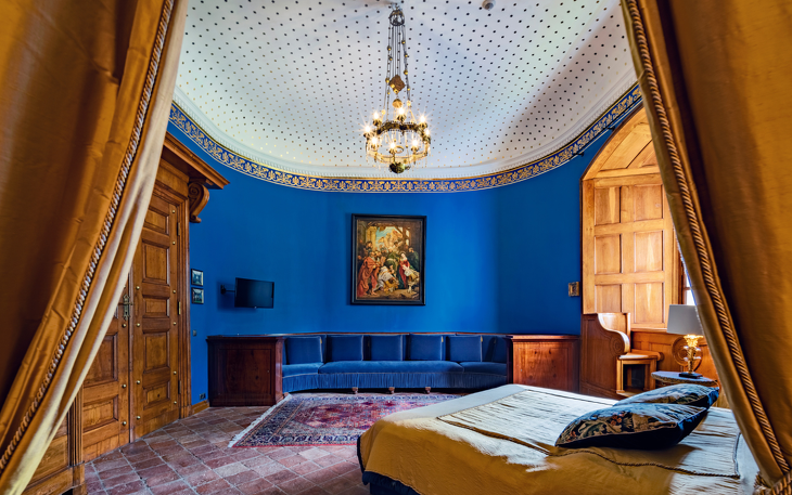 Das Königsappartement besteht aus zwei sorgfältig restaurierten historischen Räumen – dem Blauen Raum und dem Roten Raum, die zu Zeiten der Hohenzollern-Königsfamilie die wichtigsten repräsentativen Räume des Schlosses waren. Dies ist das größte Hotelzimmer, das mit Buntglasfenstern, Kronleuchtern, mit goldenen Sternen verzierten Decken, Täfelungen aus dem 19. Jahrhundert und stilvollen Möbeln ausgestattet ist. Die Fenster des Schlafzimmers und des Wohnzimmers blicken auf die umliegenden Hügel und Teiche. Die Wohnung verfügt über einen geräumigen Flur mit Erkerfenster auf der Seite des Innenhofs. Das individuell gestaltete Badezimmer ist mit einer Badewanne ausgestattet. Diese historischen Innenräume wurden mit außergewöhnlicher Präzision und Liebe zum Detail restauriert und bieten den Gästen außergewöhnlichen Komfort und das Gefühl, in die Vergangenheit zu reisen. Die Wohnung liegt im ersten Obergeschoss und ist über ein repräsentatives Treppenhaus erreichbar.