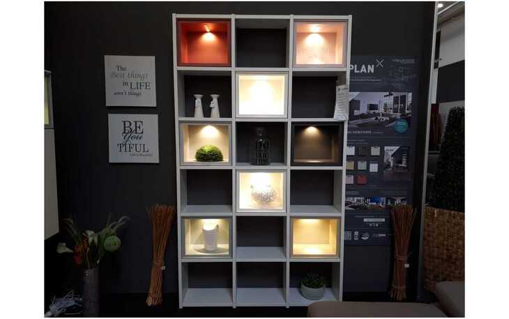 Korpus: Lack kristallweiß matt mit Beleuchtung, Regaleinsätze in verschiedenen Farben B 130 H 226 T 26