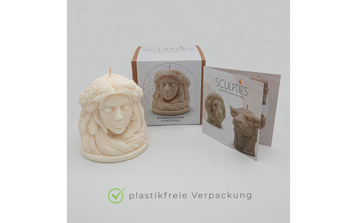 Die Kerze „Sternzeichen Jungfrau“ ist eine Skulptur aus Rapswachs und ein besonderes Geschenk für Menschen mit diesem Sternzeichen (24. Juli bis 23. Juli). Sie wurde in der Sculpties Manufaktur designt und wird von Hand gegossen.