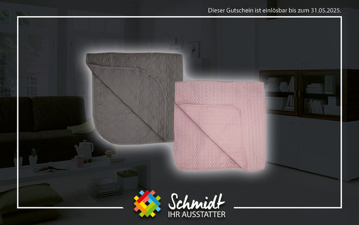 Mit dem Gutschein für die Tagesdecke "Nancy" (280x250 cm) haben Sie die Wahl zwischen den Farben Grau oder Rosa und können Ihrem Zuhause einen Hauch von Gemütlichkeit verleihen. Die hochwertige Decke eignet sich ideal für entspannte Abende auf der Couch oder als stilvoller Bettüberwurf. Sie ist nicht nur ein funktionales Wohnaccessoire, sondern trägt auch zu Ihrem Wohlbefinden bei und verleiht jedem Raum eine behagliche Atmosphäre. Verschönern Sie Ihr Zuhause und genießen Sie den Komfort dieser vielseitigen Tagesdecke.