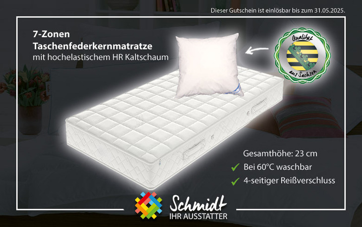 Mit diesem Gutschein erhalten Sie die hochwertige Matratze Traumland 7000, wahlweise* im Härtegrad H2 oder H3, sowie ein edles Kopfkissen, gefüllt mit 1000g Gänsefedern eines regionalen sächsischen Herstellers.