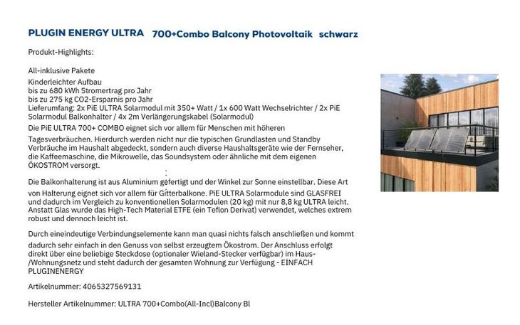 - Lieferumfang: 2x PiE ULTRA Solarmodul mit 350+ Watt / 1x 600 Watt Wechselrichter / 2x PiE Solarmodul Balkonhalter / 4x 2m Verlängerungskabel (Solarmodul)