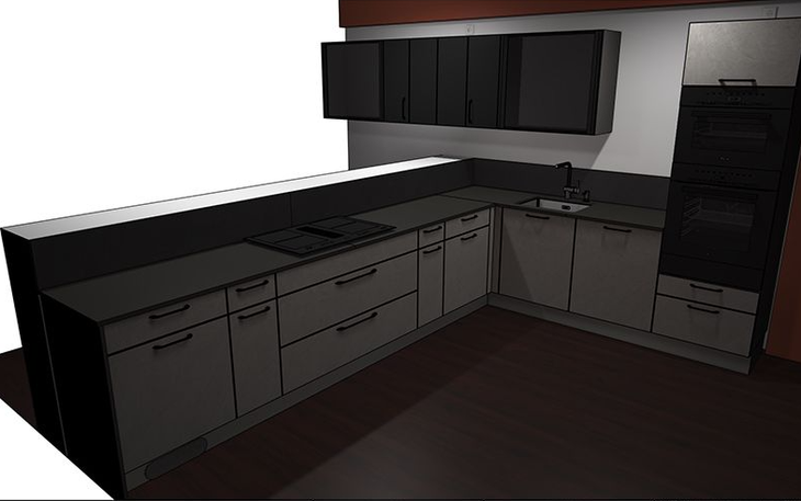 - die Unterschränke sowie den Hochschrank mit Fronten in „Schiefer steingrau Nachbildung“ in der dargestellten L-Form sowie die Hängeschränke mit schwarzen Fronten,