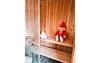 Hier unterscheiden sich die Doppelhäuser in ihrer Aufteilung: Auf der linken Haushälfte befindet sich eine Sauna mit separater Dusche und zwei einzelne Sofas,die in der Nacht als Bett umgewandelt werden können. Auf der Dachterrasse mit Seeblick, befinden sie zwei Liegen zum Ausruhen nach jedem Saunagang. Auf der rechten Haushälfte befinden sich im oberen Geschoss ein vollwertiges Schlafzimmer mit einem Doppelbett. Die Dachterrasse lädt mit ihrer Lounge zum Verweilen ein. Auch hier ist der Seeblick garantiert. Jede Ferienwohnung verfügt im Erdgeschoß über eine große Terrasse mit Gartenmöbeln.