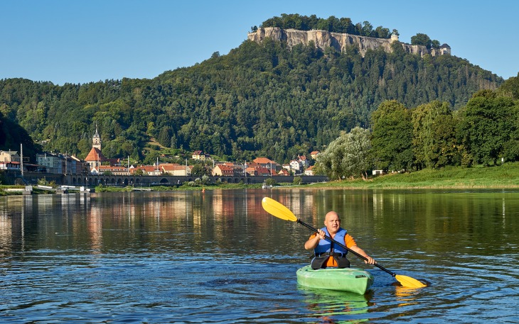 Erkunden Sie im 1ner Kajak auf unserer Langstrecke von Königstein nach Dresden Laubegast die Sächsische Schweiz und die Vororte von Dresden aus der Wasserperspektive bei einer Paddeltour.
