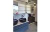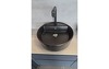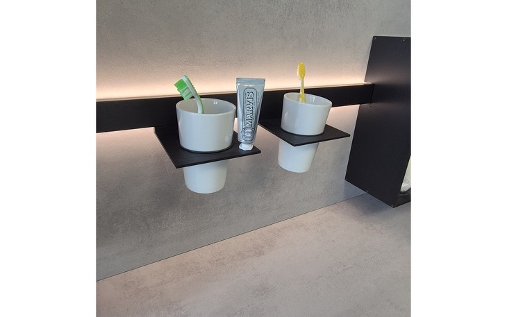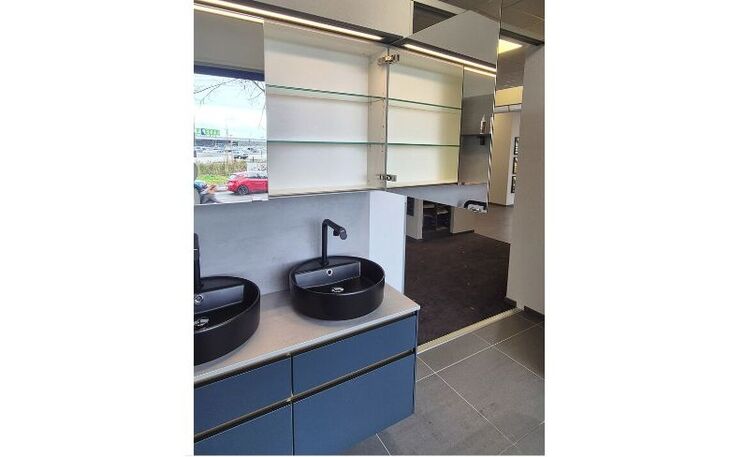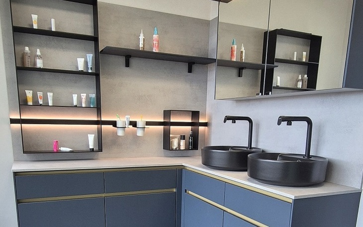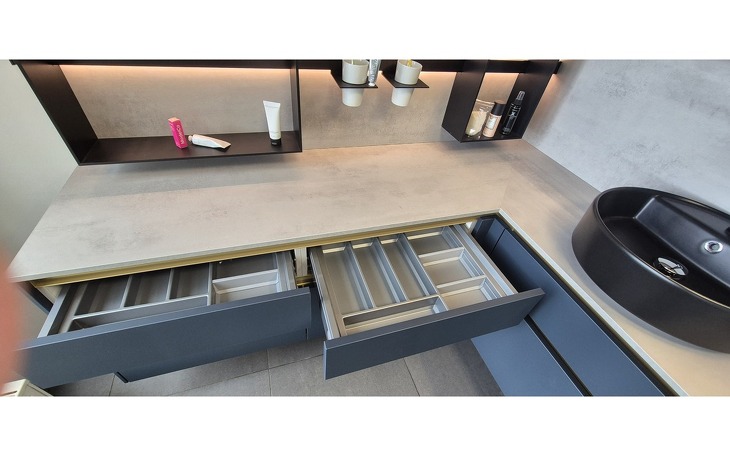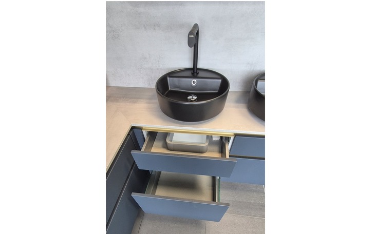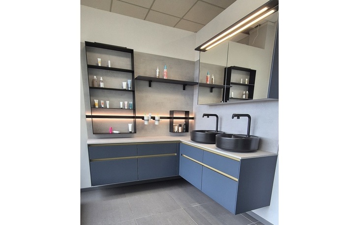 Angeboten wird diese hochwertige Badeinrichtung in ultramattem fjordblauem Lacklaminat mit edlen goldfarbigen Griffmulden und schwarzen Aufsatzwaschtischen aus Keramik. Die Armaturen sind natürlich auch in schwarz gehalten. Der raffinierte Spiegelschrank ist von innen und außen verspiegelt. Über dem Spiegel und im Regalsystem gibt es LED-Beleuchtungen. Die Rückwände und Schrankabdeckungen sind in Betonoptik gehalten.