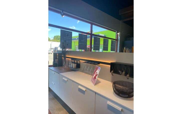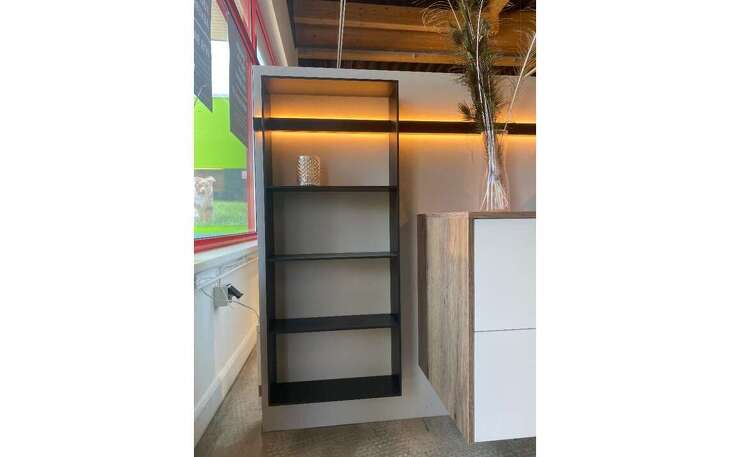 Dazu gehört (im Preis enthalten) wie auf den Fotos zu sehen ein Aluminium-Profil (L = ca. 330cm) mit LED-Beleuchtung mit verschiedenen Zubehör und ein Alu-Regal (B = ca. 45cm), H = ca. 108cm) wie auf dem Foto zu sehen.