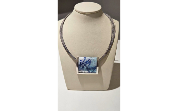 Das 20fache Edelstahl-Collier ist ein Unikat mit einzigartigen Farb- und Strukturverläufen aus Bildfragmenten des Künstlers Jürgen Kreuchauff.