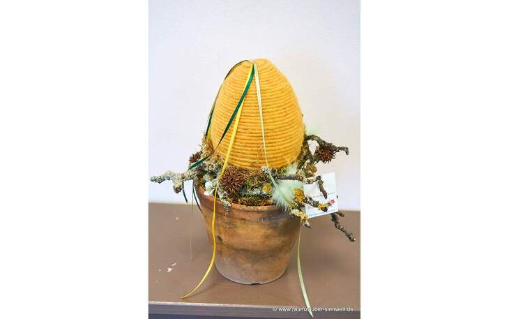 Die Osterdekoration besteht aus Filz und Naturmaterialien im Tontopf und wurde von uns in künstlerischer Handarbeit selbst gefertigt.