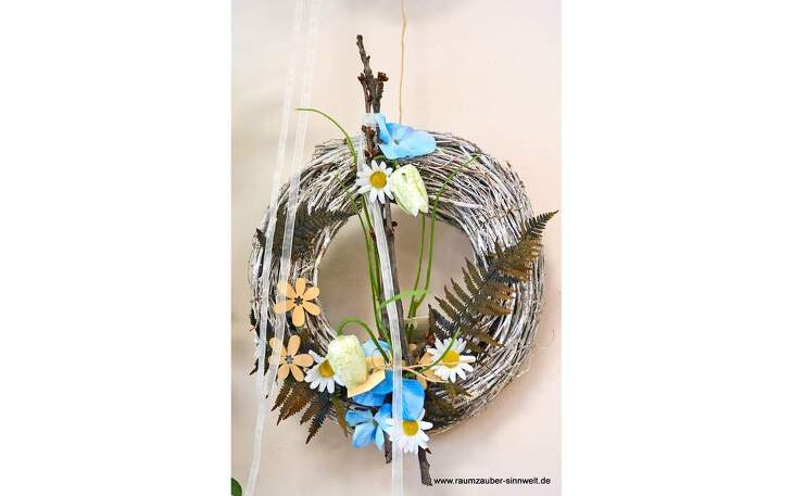 Weidenkranz mit Seidenblüten und Naturmaterialien dekoriert