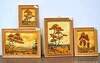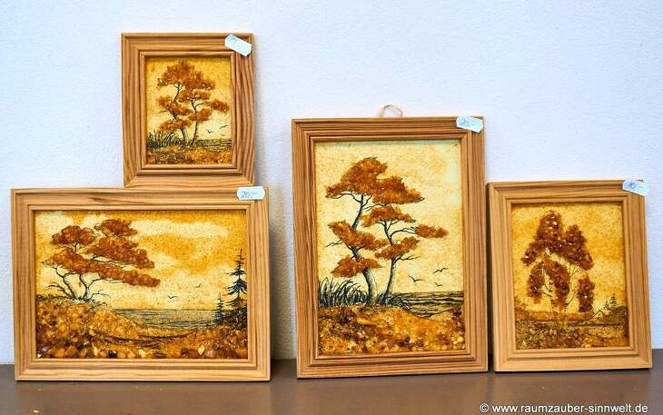 Vier Holzbilderrahmen mit Bernsteinmotiven.