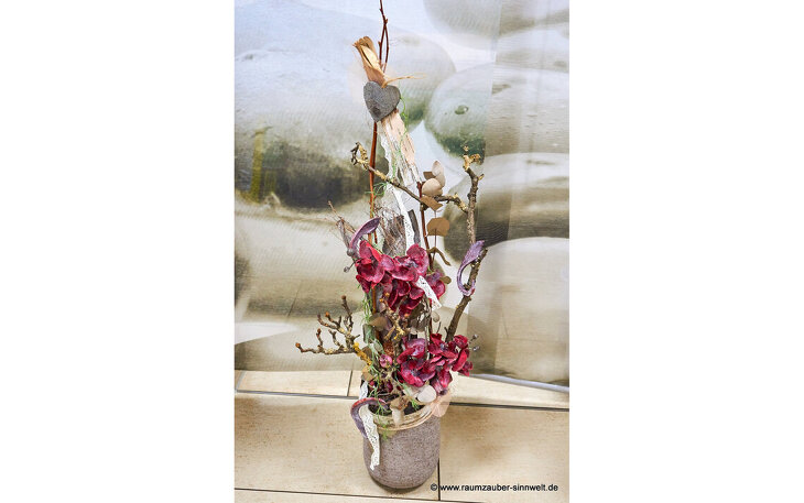 Die Dekoration ist jahreszeitlich neutral und wurde von uns in künstlerischer Handarbeit selbst gefertigt.