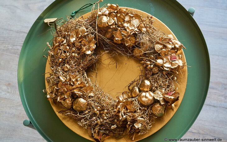 Wandkranz aus goldgesprühten Naturmaterialien auf Dekoteller