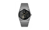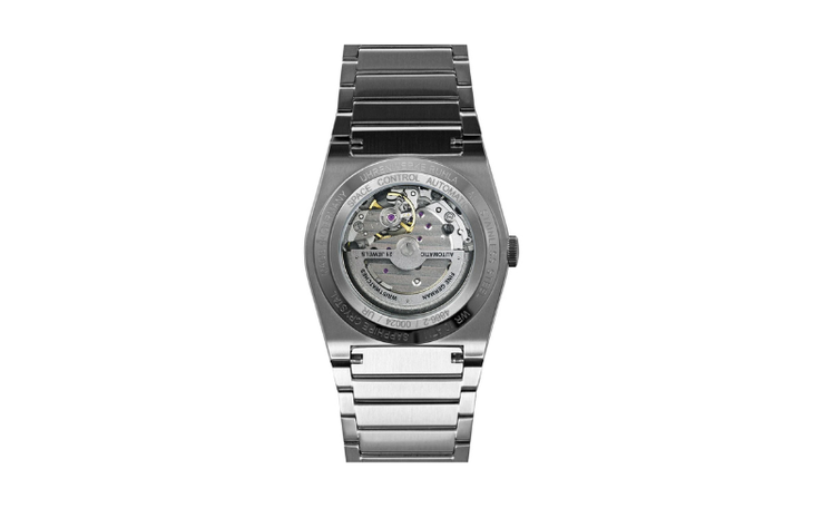 Das Gehäuse und das integrierte Gliederarmband aus satiniertem Edelstahl wirken kantig und solide, was der Uhr eine moderne, fast architektonische Präsenz verleiht. Rückseitig gibt ein Sichtboden das fein veredelte Automatikwerk frei, inklusive Genfer Streifen und dezent eingesetzten Farbakzenten durch Lagersteine – funktionale Mechanik, sichtbar gemacht.