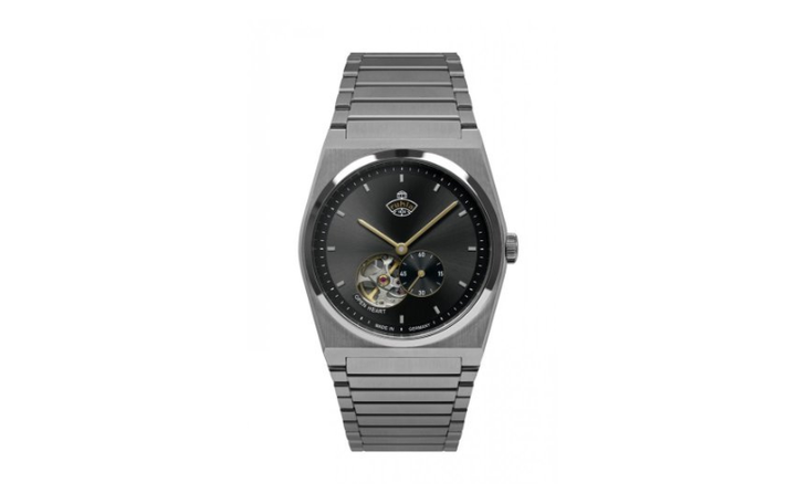 Die Ruhla 1929 Space Control Automatik zeigt sich in einem klaren, technisch inspirierten Design mit einem matten, anthrazitfarbenen Zifferblatt, das je nach Lichteinfall leicht changiert.
