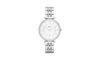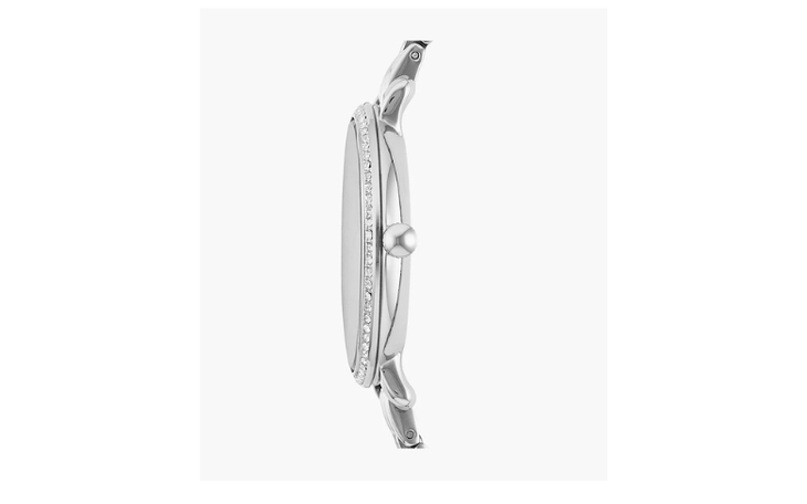 Die Uhr ist komplett in Edelstahl gearbeitet. Die Damenuhr von Fossil ist klassisch gestaltet und mit auffälligen Schmucksteinen versehen.