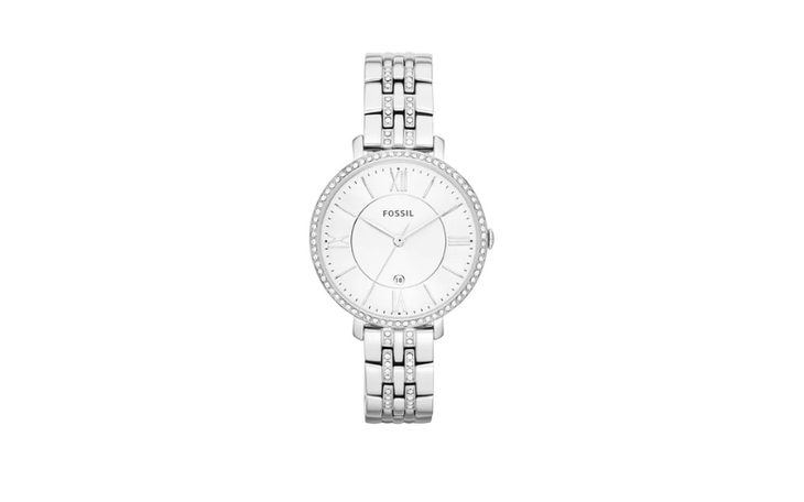 Die Damenuhr von Fossil ist klassisch gestaltet und mit auffälligen Schmucksteinen versehen. Sie finden sich auf der Lünette und auch dem Gliederarmband wieder.