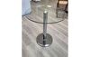 Das Ausstellungsstück ist ein runder Glastisch mit verchromtem Mittelfuß, Durchmesser 70cm, Höhe 74cm (Sitzhöhe).