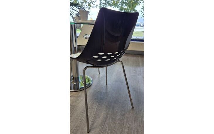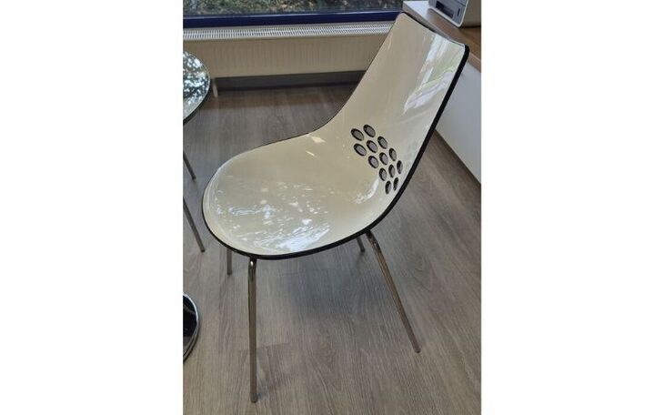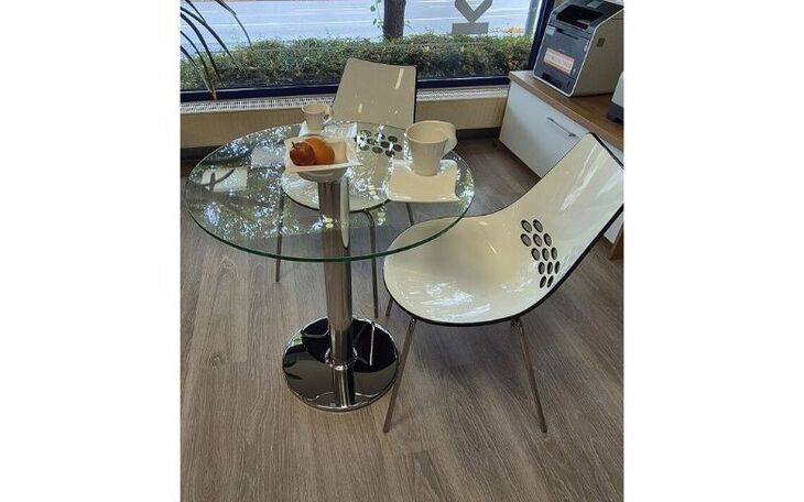Die Ausstellungsstücke sind zwei Stühle mit Sitzschalen aus Acryl weis/schwarz Gestell Chrom und ein Glastisch rund 70cm, Höhe 74cm.