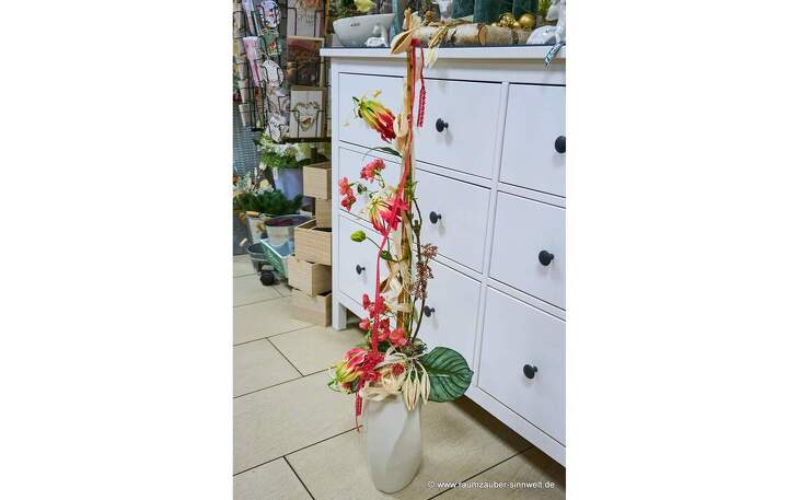 Seidenblumendekoration mit Naturmaterialien in Bodenvase Diolo von Tiziano. Die Dekoration ist jahreszeitlich neutral und wurde von uns in künstlerischer Handarbeit selbst gefertigt.